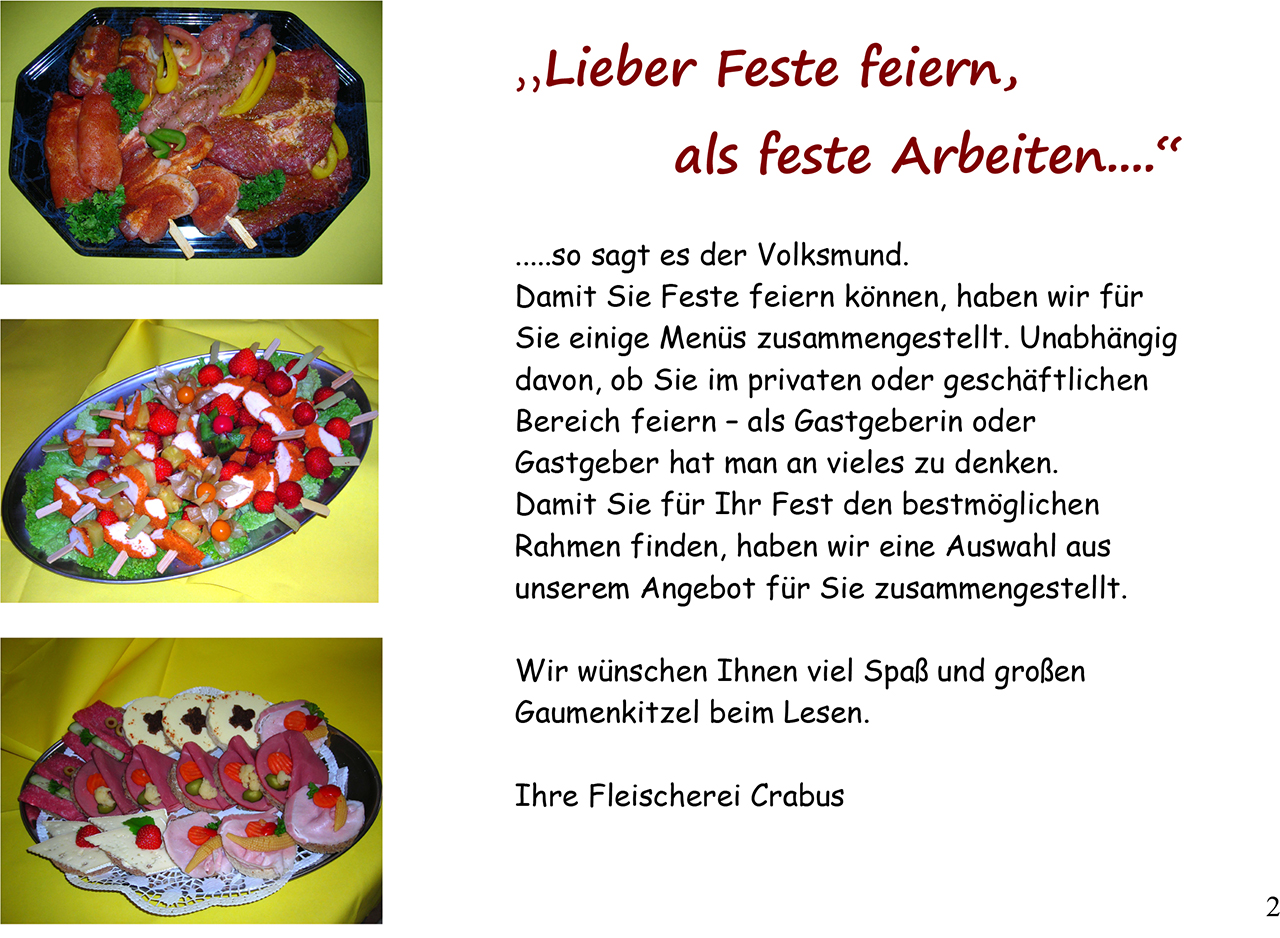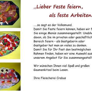 Seien Sie Ihr eigener Gast und besprechen mit uns die Zusammenstellung der Speisen. Wir liefern das Buffet zur vereinbarten Zeit an den richten Ort. Wenn Sie es wünschen richten wir Ihr festliches Buffet auch für Sie an und achten darauf, dass die Optik stimmt, denn bekanntlich ist das Auge ja mit!